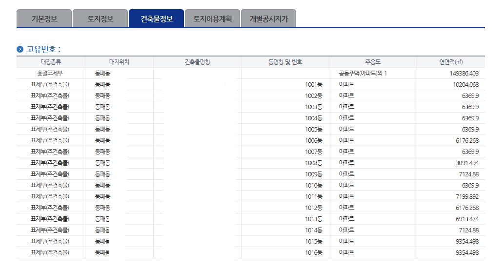 검색이 완료되면 해당 아파트의 정보가 화면 하단에 나타납니다. 만약 검색 결과가 올바르다면, 중간에 위치한 메뉴 중 [건축물정보]를 선택하고 원하시는 동의 이름과 번호를 선택합니다.